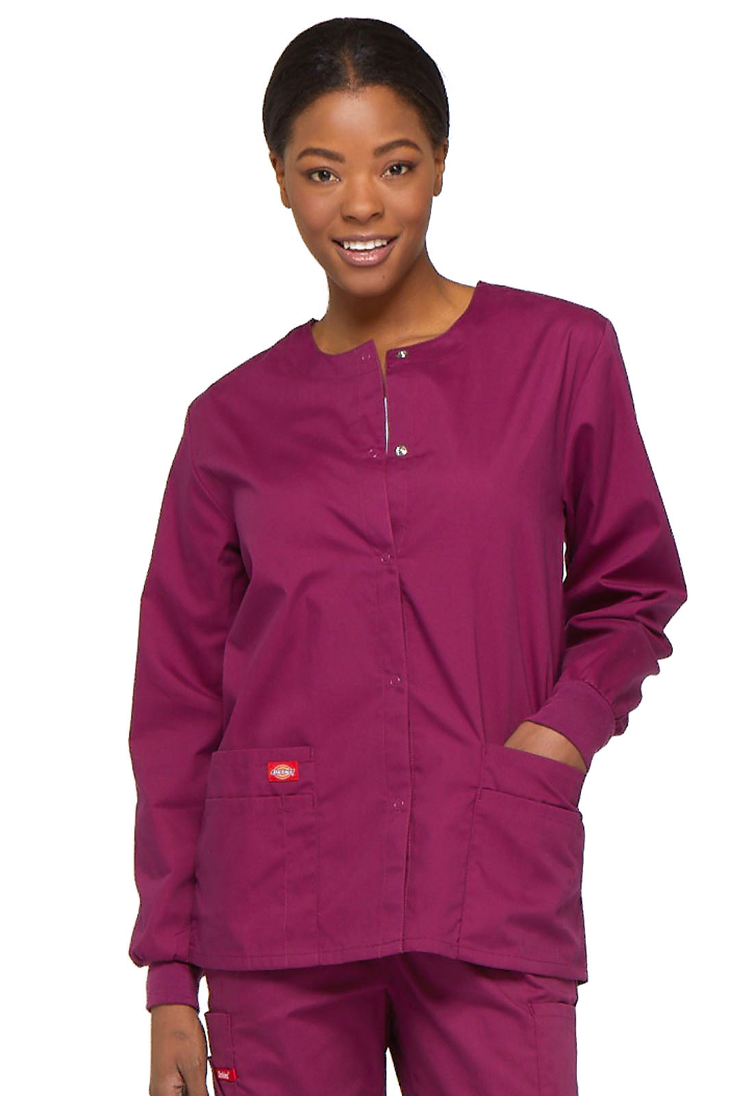 A Modern Classic fit round neck, snap front, warm-up jacket features Dickies logo twill tape at the back neck and an instrument loop on the left pocket. Also featured are knit cuffs, multiple patch pockets, a stretch Red knit interior pocket (White knit pocket on White), a back yoke and side vents. Center back length: 28 1/2".