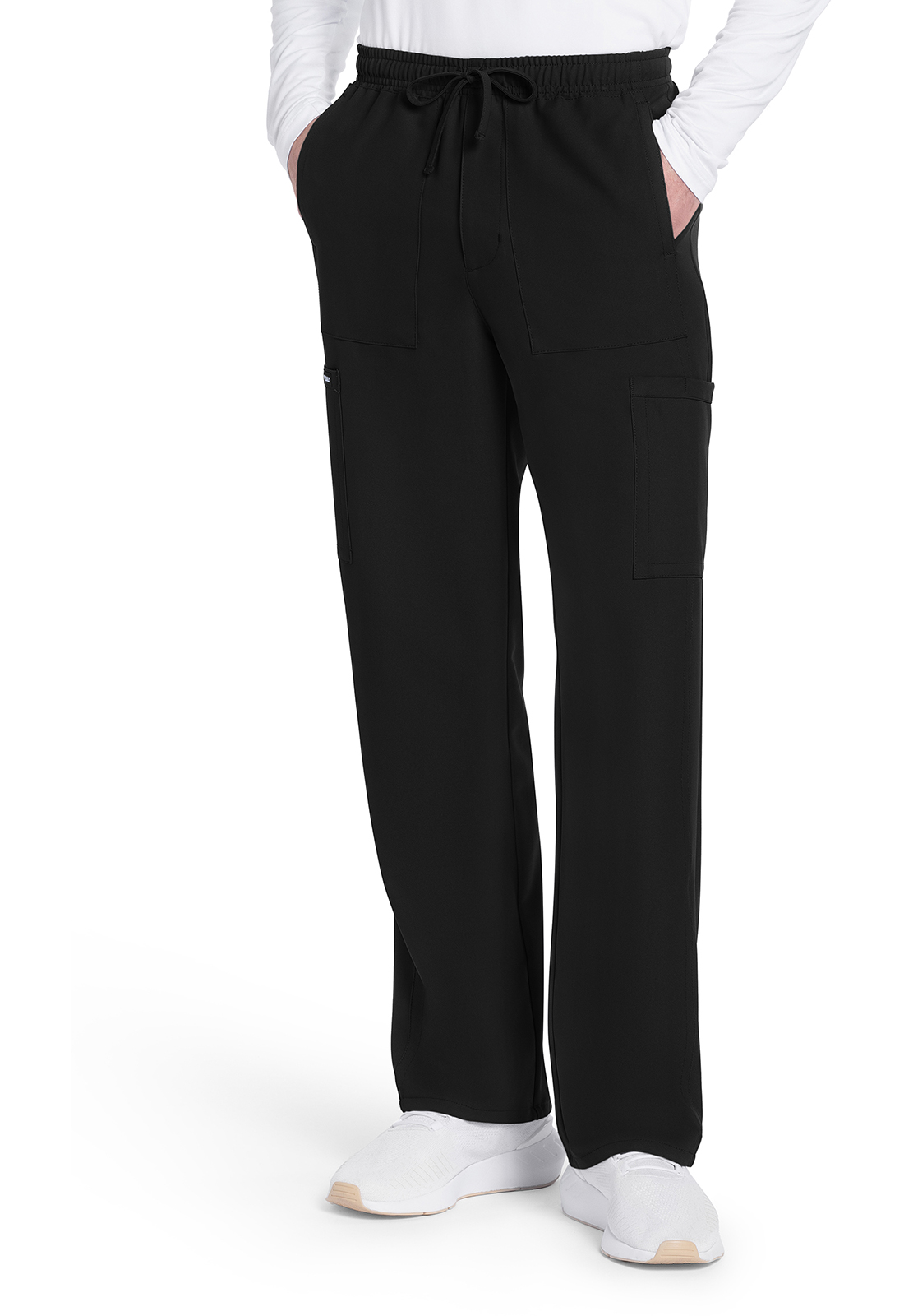 A true Men's fit pant with zipper fly, this style offers lots of pockets and functional styling. The mid rise elastic-reinforced waistband includes a drawstring for adjustability. There are six pockets for organized storage: two side entry patch pockets, two cargo pockets with pen/instrument slots, and two back patch pockets. The cargo pockets and back pockets have reverse hem trim for added detailing. Forward leg seams provide leg-lengthening style. Decorative tonal topstitching finishes this style. Straight leg, 19" opening. Inseam: 32"