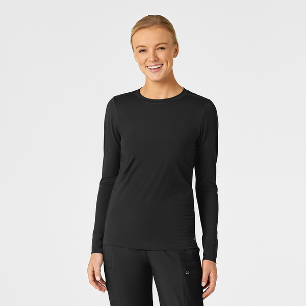 Wink Layers Performance Long Sleeve Tee has HeiQ Smart Temp Activated Cooling that keeps you cool for all day comfort. This patented technology is activated by your rising body temperature and deactivates once cooling is complete. Durable yet lightweight and breathable this tee has the perfect height crew neckline that rests comfortably across your collarbone and provides great coverage making it the perfect underscrubs tee. The center back of this long sleeve tee features a reflective loop accent that can be used to keep your headphone wires securely out of the way. Unbelievably soft, layering in this Wink performance tee provides the perfect amount of warmth whether you are on shift or out running errands.