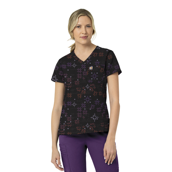The Carhartt fabric technologies are an absolute expectation from the Carhartt wearer and this style is no different. This scrub top features the Rugged Flex(tm) technology that offers stretch and comfort designed to move with you on the job. The flattering and slightly more feminine curved v-neckline combined with the princess seaming in both front and back offer a stylish look. The curved shirttail with side hem vents offers a tuck-in option or a fashionable untucked version of this shirt. The back features a vented mesh-lined panel for breathability and comfort. Of course, the badge ID loop in the shoulder seam, the layered chest pocket with a pen slot, and the dobby stretch fabric come together for a functional and comfortable scrub top. The style is offered in a variety of prints each season. C13014